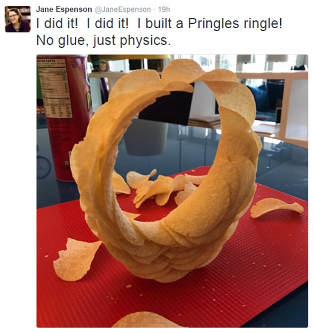 【環(huán)球網(wǎng)綜合報(bào)道】據(jù)英國(guó)《每日郵報(bào)》10月25日?qǐng)?bào)道,近日,網(wǎng)絡(luò)上一張圖片被網(wǎng)友們轉(zhuǎn)發(fā)了5萬多次。據(jù)悉,這張圖片由居住在美國(guó)洛杉磯的電視編劇珍妮·埃斯彭遜(Jane Espenson)拍攝,內(nèi)容為她用品客薯片搭建的一個(gè)小圓環(huán)。