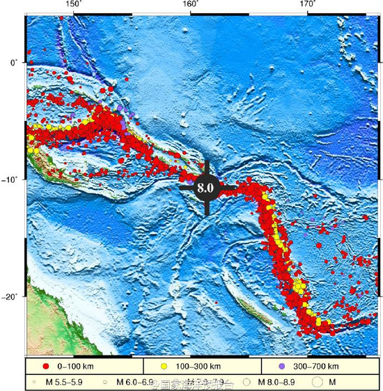 國家海洋預報臺:#海嘯信息#2016年12月9日1時38分(北京時間),所羅門群島海域(10.70°S,161.40°E)發生8.0級地震,震源深度為40.0千米。國家海洋局海嘯預警中心(國家海洋預報臺)根據初步地震參數判斷,地震可能會在震源周圍引發大規模海嘯,但不會對我國沿岸造成災害性影響。