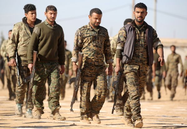 敘利亞民主軍戰士10日在拉卡郊外準備對IS發起進攻(法新社)