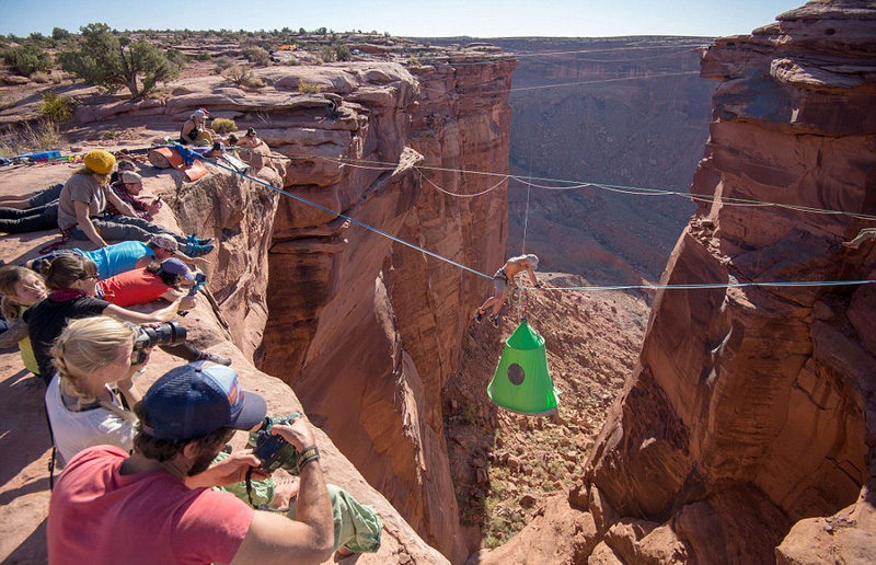 據英國《每日郵報》12月8日報道,近日,一群冒險愛好者在美國尤他州的莫泊峽谷體驗了一次高空露營,在高100多米的懸崖之間搭建了一頂懸空的帳篷。攝影師布瑞恩 莫斯博(Brian Mosbaugh)用相機記錄下這驚險的一幕。
