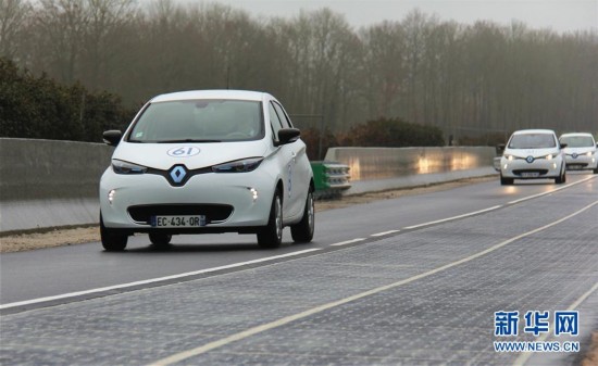 12月22日,汽車行駛在法國西北部圖魯夫爾歐佩爾什鎮的“太陽能公路”上。