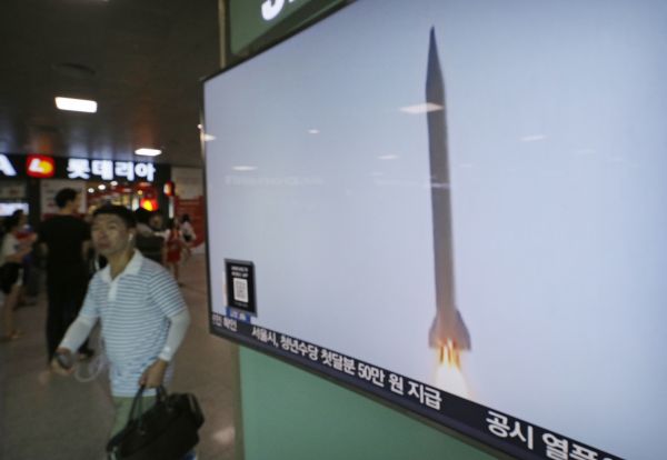 資料圖片: 2016年8月3日,在韓國首爾火車站,一名男子經(jīng)過播放朝鮮發(fā)射導(dǎo)彈資料畫面的顯示屏。 韓國軍隊(duì)聯(lián)合參謀本部3日稱,朝鮮當(dāng)天早晨向朝鮮半島東部海域發(fā)射1枚彈道導(dǎo)彈。 新華社/美聯(lián)