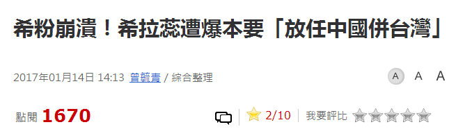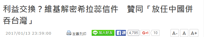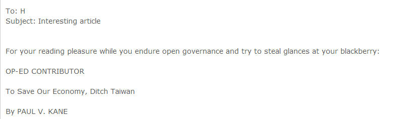 【環球網綜合報道 郭鵬飛】2011年11月10日,《紐約時報》曾經刊登一篇題為《為拯救美國經濟,舍棄臺灣吧!》(To Save Our Economy, Ditch Taiwan)的文章。作者是哈佛大學肯尼迪學院國際安全問題的前研究員保羅·凱恩。事隔多年,臺灣東森新聞云、中時電子報等多家媒體14日爆出一則驚人消息。在維基解密曝光的希拉里一封郵件中,她曾經公然為該文章“點贊”,稱“這個想法很聰明,讓我們來討論吧!毕⒁怀觯_灣民眾一片嘩然。要知道,在臺灣,一直有不少民眾對希拉里的政見表示支持。