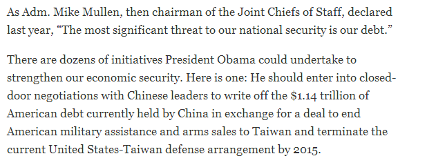 文章中稱,“對美國國家安全最大的威脅,是美國的債務!痹诩訌娒绹慕洕踩矫妫瑠W巴馬總統有許多措施可選,比如組織一次有中國領導人參加的閉門會議。議題是終止美國對臺灣的軍援和軍售,在2015年以前廢除美臺防衛協議,以此交換中國豁免其持有的美債,這一數字已高達1.14萬億美元。