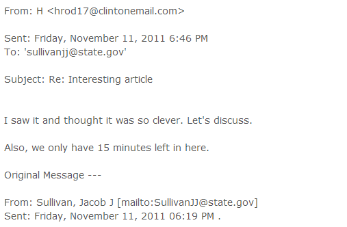 根據維基解密公布信息顯示,希拉里在2011年11月11日的私人郵件中提到,為拯救美國經濟,希拉里顧問的雅各布·沙利文(Jacob Jeremiah Sullivan)通過郵件向希拉里轉發了該文章,郵件主題注明“有趣的文章”。郵件內文寫到,“當你正在忍受你公開的管理工作時,這將給你帶來閱讀樂趣,試著瞅一眼你的黑莓手機吧!
