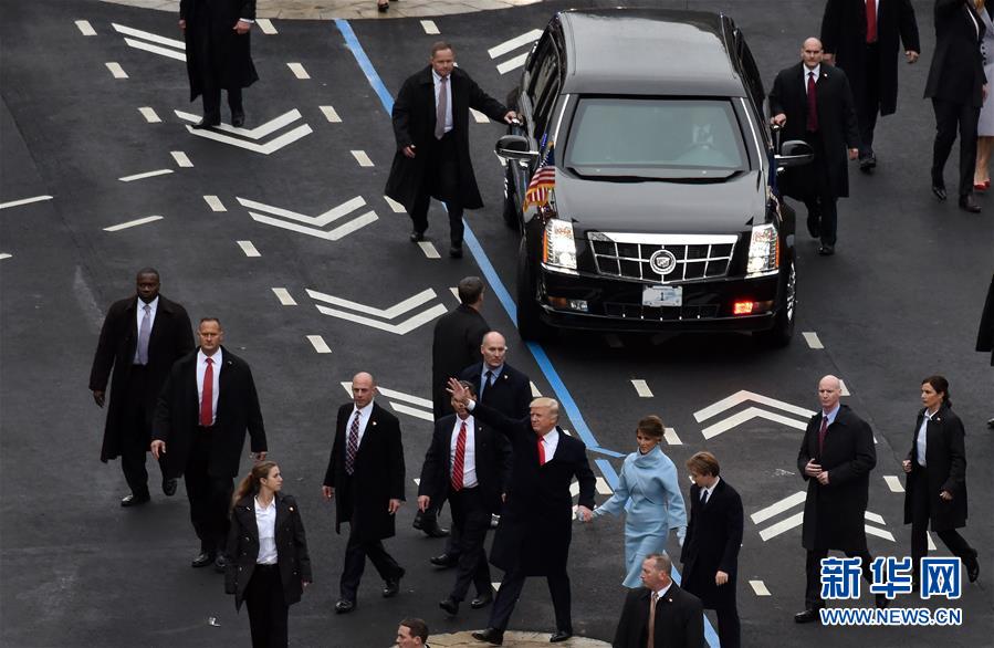 1月20日,在美國首都華盛頓舉行的總統(tǒng)就職游行上,美國總統(tǒng)特朗普(前中)向人們揮手致意。美國總統(tǒng)特朗普的就職游行20日在華盛頓舉行。特朗普當日在華盛頓國會山舉行的就職典禮上正式宣誓就任美國第45任總統(tǒng)。 新華社記者殷博古攝