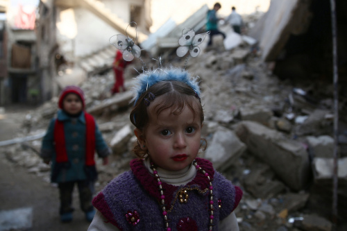 然而,戰(zhàn)火并未抹去敘利亞兒童的天真爛漫,童心猶在。近日,有攝像師在大馬士革郊區(qū)的一片廢墟中拍到一位美麗的敘利亞小女孩,她頭戴一只有兩只蝴蝶造型的藍色毛絨發(fā)卡,行走間蝴蝶也跟著“翩翩飛舞”,十分美麗。