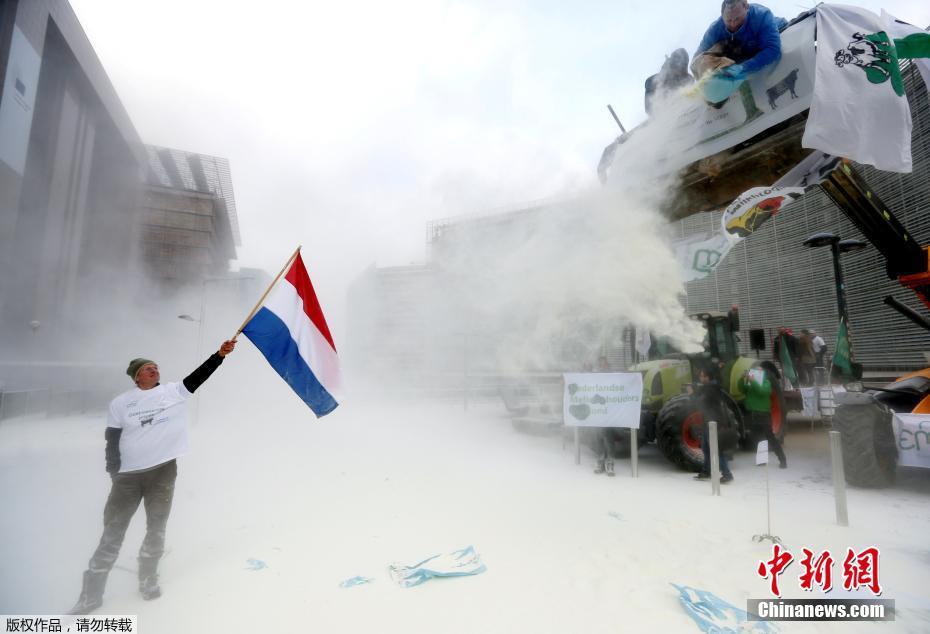 當地時間2017年1月23日,比利時布魯塞爾,歐洲奶農在歐盟理事會大樓外噴灑奶粉抗議奶市場危機,而歐盟各成員國農業部長們當時正在這座變成奶白色的大樓中召開2017年首次部長級會議。