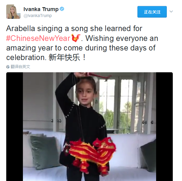2日一大早,伊萬卡發(fā)了這樣一條推文:“阿拉貝拉唱著她從中國新年學到的歌曲,在這節(jié)日慶典之際,祝愿每個人都有個精彩的新年。新年快樂!”其中最后“新年快樂”4字是用中文所寫,并配發(fā)了女兒用普通話演唱中國歌曲《新年好》的視頻。