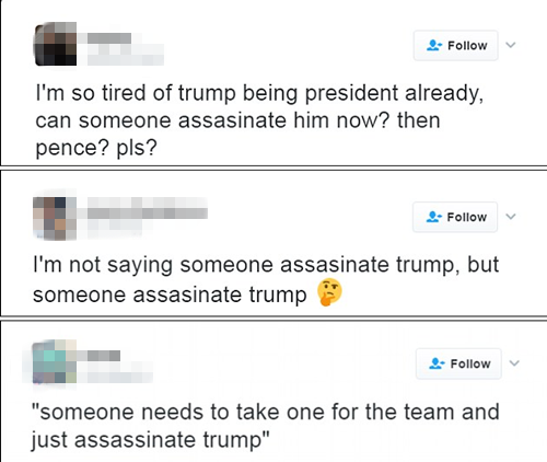 國際在線專稿:據(jù)英國《每日郵報》2月3日報道,實時社交網(wǎng)絡(luò)大數(shù)據(jù)分析企業(yè)Dataminr日前公布數(shù)據(jù)顯示,自從特朗普(Donald Trump)就職美國總統(tǒng)以來,在社交網(wǎng)站推特上,已經(jīng)有12000多條推文呼吁將其刺殺。