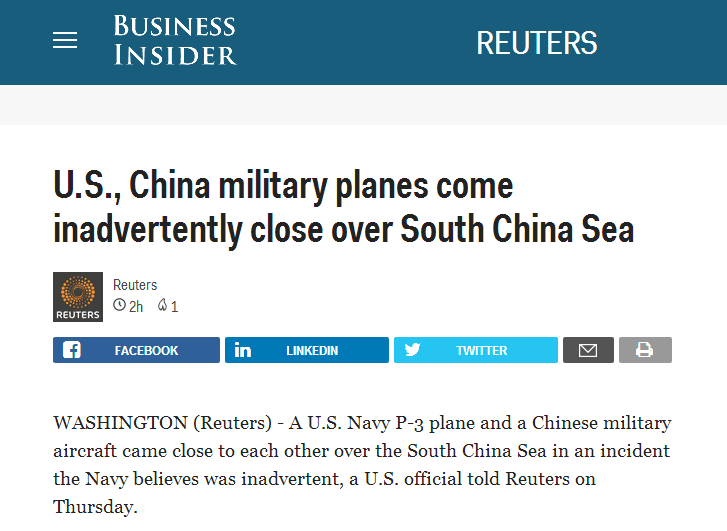 僅相隔305米!美官員稱中美軍機南海上空“非故意接近”