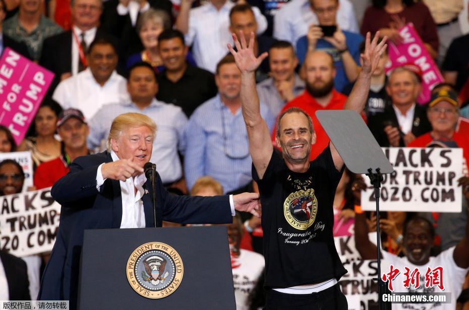當地時間2017年2月18日,美國佛羅里達州墨爾本,美國總統特朗普在奧蘭多-墨爾本國際機場舉行演講。在演講過程中,特朗普邀請觀眾席的一名支持者跳過防護欄到臺上。在這名支持者翻越防護欄上臺的同時,特勤局保鏢試圖阻止他的舉動,但被特朗普叫停。