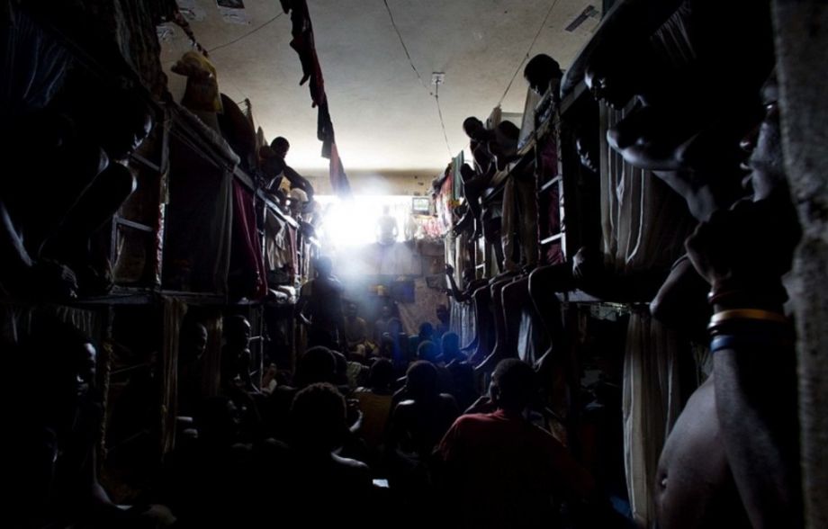 據(jù)英國(guó)《每日郵報(bào)》報(bào)道,近日,一組關(guān)于海地國(guó)家監(jiān)獄的照片曝光,囚犯?jìng)冊(cè)趽頂D臟亂的國(guó)家監(jiān)獄里生活,忍受著營(yíng)養(yǎng)不良和傳染病的折磨,惡劣的環(huán)境已經(jīng)導(dǎo)致海地監(jiān)獄里的囚犯死亡人數(shù)急劇上升,僅上個(gè)月就有21名囚犯死亡。圖為囚犯?jìng)償D在陰暗狹小的牢房里看電視。電視是囚犯?jìng)冏约簻愬X買來的。