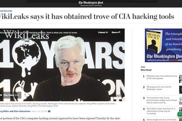 《華盛頓郵報》7日報道:“維基解密稱已掌握中情局黑客攻擊的工具箱。”