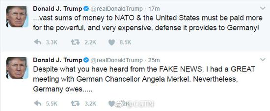 特朗普發推文回應會見默克爾時不握手尷尬事件,并稱“德國欠北約和美國一大筆錢,德國應為軍事防御付出更多費用”。