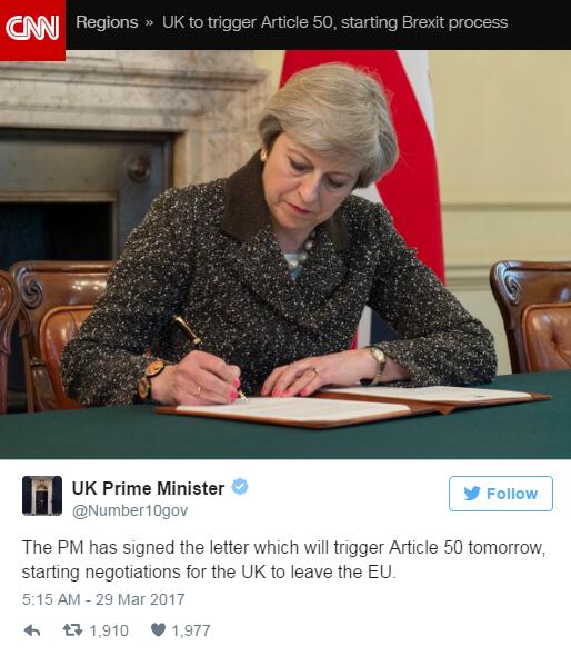 【環球網報道 記者 王一】據美國有線電視新聞網3月28日報道,英國首相特雷莎·梅28日簽署歷史性的信函,將在29日交給歐盟,啟動英國脫離歐盟程序。