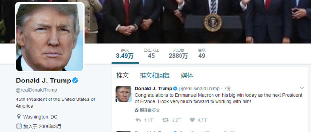 美國總統(tǒng)特朗普第一時間發(fā)推特表示祝賀。他在推文中說:“恭喜馬克龍在今日大勝成為下一任法國總統(tǒng)。我非常期待與他合作。”