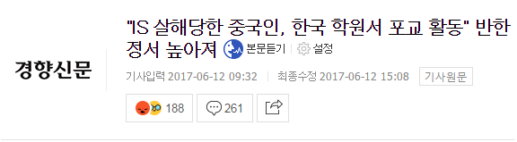 韓國《京鄉(xiāng)新聞》報道稱,被IS殺害的中國人被證實通過韓國人開設(shè)的學校進行傳教活動,中國網(wǎng)絡(luò)上反韓情緒再度高漲。