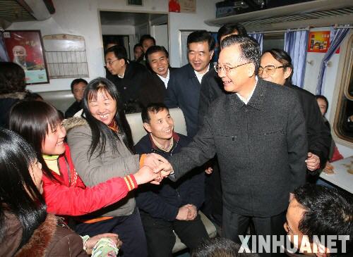1月30日,中共中央政治局常委、國務院總理溫家寶在廣州火車站看望旅客。這是溫家寶總理登上一列即將開往武昌的列車與旅客交談。這列火車是從南昌緊急調來支援廣州車站的。 新華社記者姚大偉攝