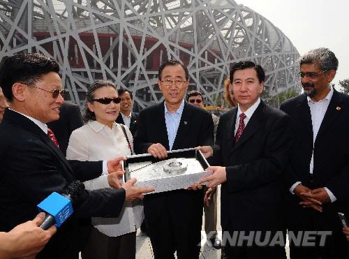 7月2日,正在中國進行正式訪問的聯合國秘書長潘基文參觀國家體育場——“鳥巢”。這是潘基文在“鳥巢”接受“鳥巢”模型禮品。 新華社記者 李濤 攝
