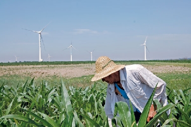 從長城出發驅車20分鐘,就來到了官廳水庫。在水庫南岸,帶著草帽的農民正在勞作,他們頭上優雅的風力發電扇葉正迎著微風慢慢地旋轉,“耕耘”著大自然的風能。