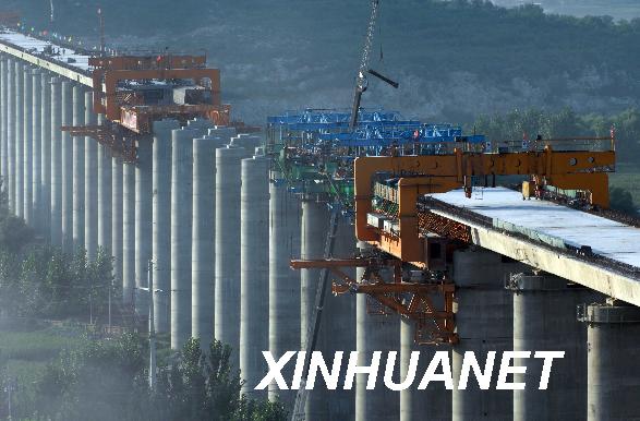 石太鐵路冶河特大橋建設者在為空中現場澆筑橋梁做準備(攝于9月6日)。全長1688.8米的冶河特大橋是正在建設中的石太鐵路(石家莊至太原)客運專線全線控制工期的重點工程。擔負建橋施工的中鐵二十二局集團四公司的建設者采用國際先進的空中現澆技術,首次在40米高空采用移動模架現澆每孔900噸重的大型箱梁,解決了地面澆筑橋梁大面積占用耕地、大型橋梁難以輸送等問題,開創了我國空中現澆技術建設橋梁的先例。