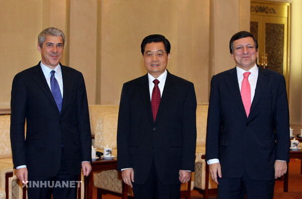 11月28日,國(guó)家主席胡錦濤在北京人民大會(huì)堂會(huì)見來京出席第十次中歐領(lǐng)導(dǎo)人會(huì)晤的歐盟輪值主席國(guó)葡萄牙總理蘇格拉底(左)和歐盟委員會(huì)主席巴羅佐。 新華社記者 樊如鈞攝