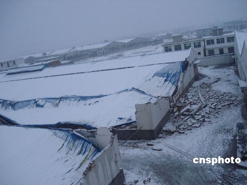 1月19日,由于連降暴雪,安徽合肥瑤海區(qū)工業(yè)園5000多平方米倉庫廠房被積雪壓塌,所幸沒有造成人員傷亡。據悉,該工業(yè)園已免費提供2萬平方米標準倉庫,在確保安全的情況下,預計1月20日組織拆遷隊伍扒開屋頂,推倒墻壁,把被埋物資全部轉移。 中新社發(fā) 何保豐 攝