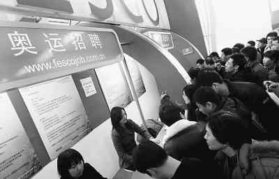 2月17日開幕的2008年北京春季招聘會首次設立了奧運專場,部分奧運供應商、服務商現場攬才。其中,一家中介機構為外資企業在奧運期間招聘400名司機,打出了最高8000元的月薪。吳長青攝