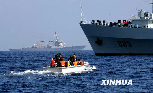 【資料圖片】2006年11月19日,中美海軍援救分隊快速向“遇險”船只抵近。 新華社記者 查春明 攝