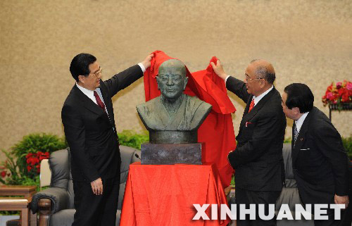5月10日,國家主席胡錦濤在奈良會見日本奈良縣知事荒井正吾,并贈送鑒真塑像。這是胡錦濤主席同荒井正吾為塑像揭幕。 新華社記者黃敬文攝