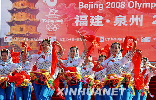 今天的泉州天氣晴好,碧空萬里,盡管并非節(jié)假日,但奧運圣火的到來還是給這個城市平添了幾分節(jié)日的色彩。泉州站傳遞的起跑儀式設在中國閩臺緣博物館正門前大廣場。在今天上午的火炬起跑儀式上,泉州市在這里安排了一些具有泉州民俗特色的舞臺表演,觀眾欣賞到了傳統(tǒng)的群鼓獅舞《鼓震名城》、大型歌舞《刺桐禮贊》、激情勁舞《青春夢飛揚》等,這也成為了今天傳遞的第一個看點。