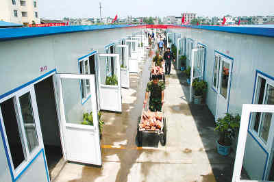 6月3日,四川綿竹災區驕陽似火,而綿竹市景觀大道兩側的過渡房建設工地仍然是一片繁忙,來自江蘇、天津和遼寧的施工人員揮汗如雨。白色的墻體、天藍的屋頂,干凈整齊的過渡房連片而起。