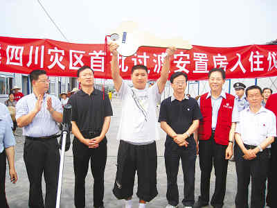 6月4日下午,北京援建的綿陽花荄過渡房——京安小區迎來了首批住戶。記者在過渡房8組01號,見到戶主趙倫全,他家幸存的五口人,全部住進過渡房。趙倫全說,他是茶坪鄉人,地震使他家房屋變成一堆廢墟。在地震后的20多天里,他先后住過茶坪、綿陽九洲體育廣場、人民公園、制藥廠等6個地方的抗震棚。他說:“現在好了,我們住進了北京為我們修建的過渡房,可以安安心心住上幾年了。”