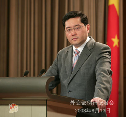 2008年8月13日,外交部發言人秦剛舉行例行記者會,就南奧塞梯局勢、巴基斯坦局勢、六方會談、北京奧運會等回答了記者提問。