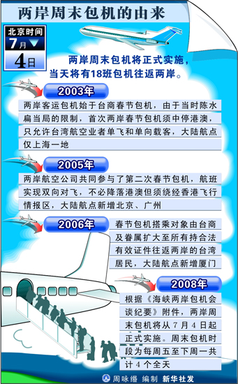 經海協會與海基會協商,兩岸周末包機于2008年7月4日啟動。