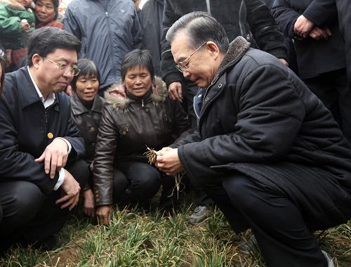 2月7日至8日,中共中央政治局常委、國務院總理溫家寶在河南檢查指導抗旱工作。這是2月7日,溫家寶在禹州市方崗鄉楊北村的麥田里察看苗情。 新華社記者 姚大偉 攝