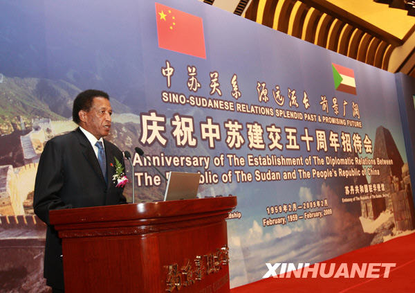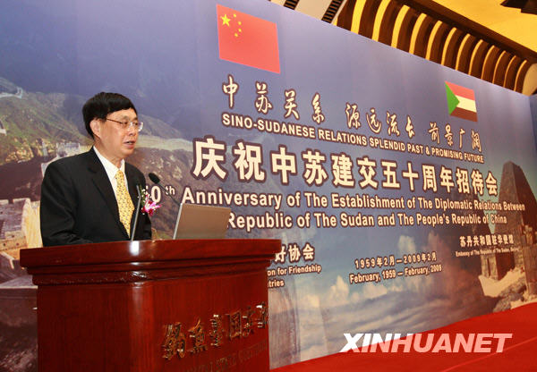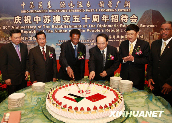 中國人民對外友好協會和蘇丹駐華大使館24日在北京舉行招待會,慶祝中國與蘇丹建交50周年。全國政協副主席阿不來提·阿不都熱西提、中國阿拉伯友好協會會長鐵木爾·達瓦買提、中國人民對外友好協會會長陳昊蘇、外交部部長助理翟雋、中聯部副部長李進軍,蘇丹駐華大使米爾加尼·穆罕默德·薩利赫等出席招待會。
