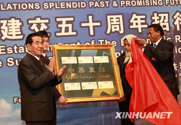 2月24日,中國阿拉伯友好協會會長鐵木爾·達瓦買提(左)與蘇丹駐華大使米爾加尼·穆罕默德·薩利赫為“中國蘇丹建交50周年首日封”揭幕。當日,中國人民對外友好協會和蘇丹駐華大使館在北京釣魚臺國賓館舉行招待會,慶祝中國與蘇丹建交50周年。新華社記者 龐興雷 攝