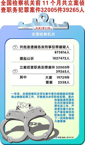 圖表:全國(guó)檢察機(jī)關(guān)前11個(gè)月共立案?jìng)刹槁殑?wù)犯罪案件32005件39265人 新華社發(fā)