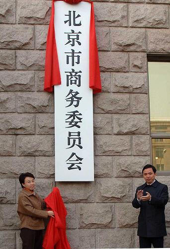 3月30日,北京市副市長程紅(左)為調(diào)整后的北京市商務委員會揭牌。北京市政府機構調(diào)整日前正式啟動,預計將于2009年上半年完成。新華社記者 公磊 攝