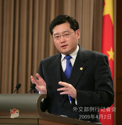 2009年4月2日下午,外交部發言人秦剛主持例行記者會,就朝鮮半島局勢、二十國集團倫敦金融峰會、中美領導人會晤、中法關系等回答記者提問。