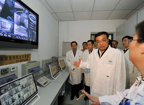 4月29日,中共中央政治局常委、國務(wù)院副總理李克強在北京首都國際機場、中國疾病預(yù)防控制中心考察人感染豬流感防控工作。這是李克強考察中國疾病預(yù)防控制中心實驗室。新華社記者饒愛民攝