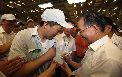 7月25日至27日,中共中央政治局常委、國務(wù)院總理溫家寶到吉林考察。這是7月26日,溫家寶在一汽轎車股份有限公司考察時(shí)應(yīng)一位工人的要求,在他的工作服上簽名留念。新華社記者 姚大偉 攝