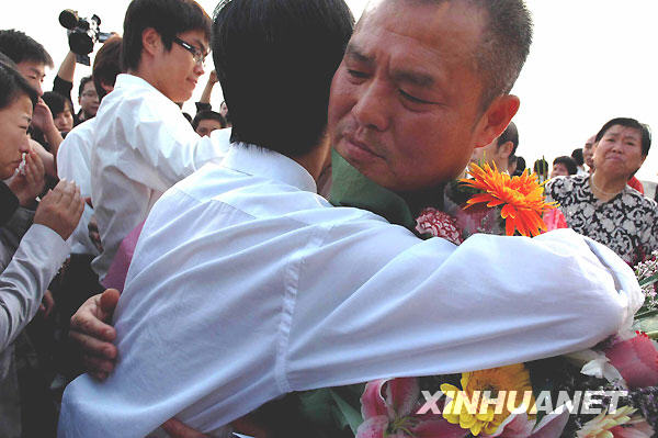 10月26日,長江大學(xué)學(xué)生與參與救助落水同學(xué)的寶塔灣冬泳隊老隊員擁抱以感謝他們的義舉。新華社記者 魏夢佳 攝