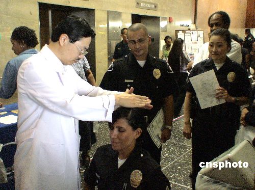 2006年八月三十一日,旅居美國的華人中醫(yī)師于士杰先生和他主持的中和漢醫(yī)院,應(yīng)洛杉磯警察局第四次邀請,為一年一度的警察健康展義務(wù)示范中醫(yī)針灸和中藥治病和養(yǎng)生術(shù)。萬名警員和文職人員大排長龍感受療效,直呼神奇。近年來,越來越多的警員到他的中醫(yī)診所醫(yī)治工傷和職業(yè)病。 中新社發(fā) 賈國榮 攝