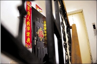 302室大門外貼著一副對聯(lián)。 記者 王磊 攝