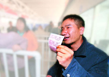 一名外來工開心地舉著到手的3張火車票;疖嚻睂嵭袑嵜,將有助改善春運“一票難求”的局面。信息時報記者 杜翠 攝