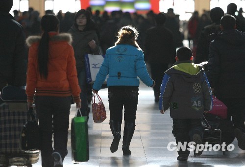 1月21日,一對母子在北京站準(zhǔn)備上車。北京鐵路局根據(jù)北京地區(qū)客流特點(diǎn)宣布,從1月20日起北京鐵路運(yùn)輸部門進(jìn)入春運(yùn)狀態(tài),這比全國春運(yùn)提前了10天,春運(yùn)將一直持續(xù)到3月10日。 中新社發(fā) 蘇丹 攝