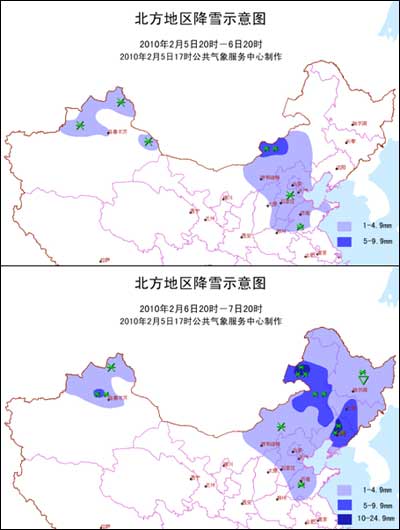 2010年2月5日20時-7日20時北方地區(qū)降雪示意圖
